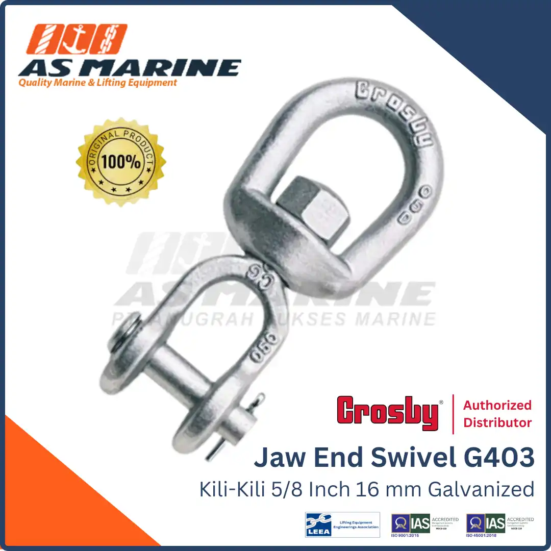 PT. Anugrah Sukses Marine adalah importir & distributor resmi CROSBY USA berstandar internasional & kami telah tersertifikasi ISO 9001:2015 & ISO 45001:2018. Kami jual CROSBY USA Jaw End Swivel / Kili-Kili G403 5/8 Inch 16 mm dan berikut spesifikasinya :