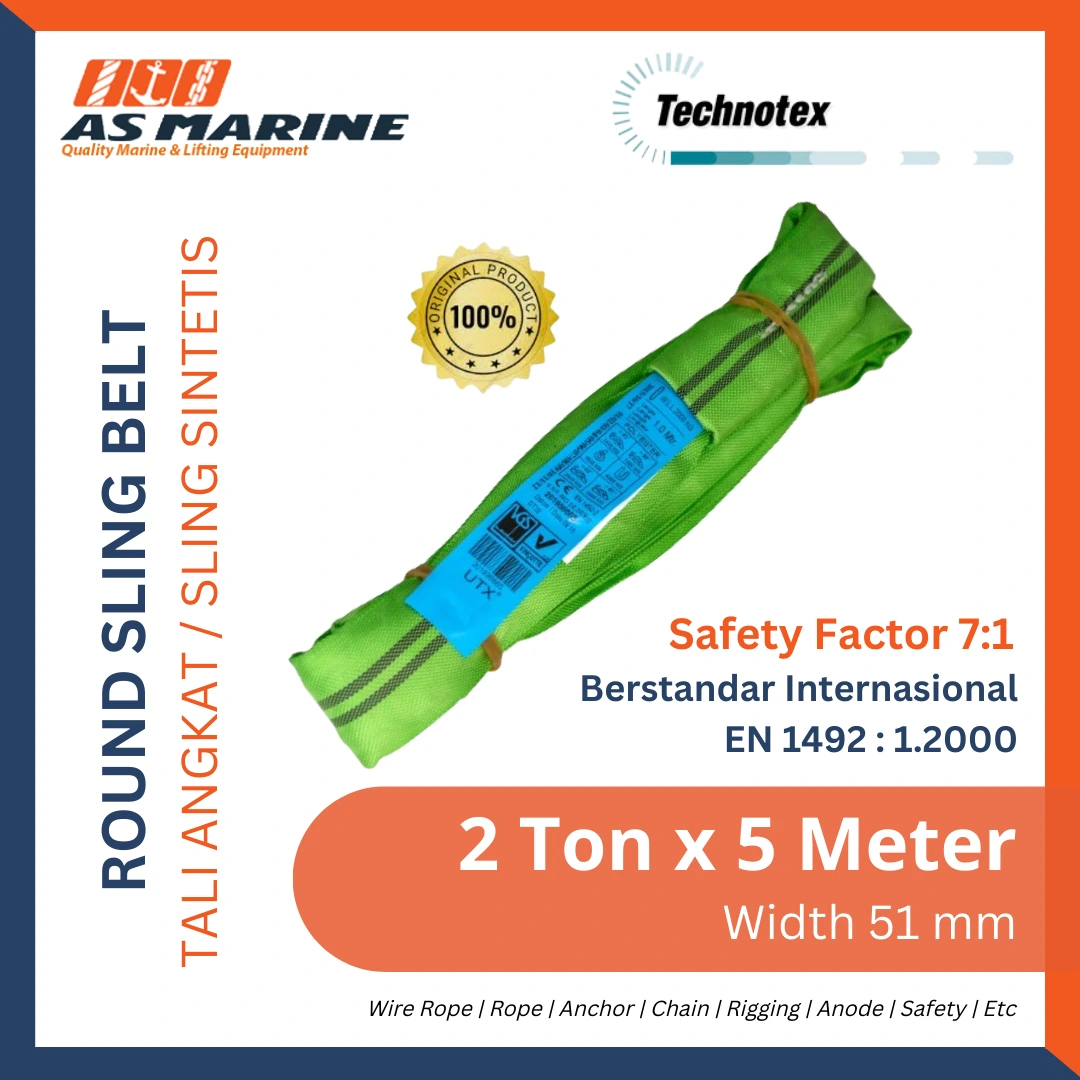 PT. Anugrah Sukses Marine adalah importir & distributor resmi berstandar internasional & kami telah tersertifikasi ISO 9001:2015 & ISO 45001:2018. Kami jual Round Sling Belt / Tali Angkat 2 Ton x 5 Meter 51 mm Technotex Holland dan berikut spesifikasinya :