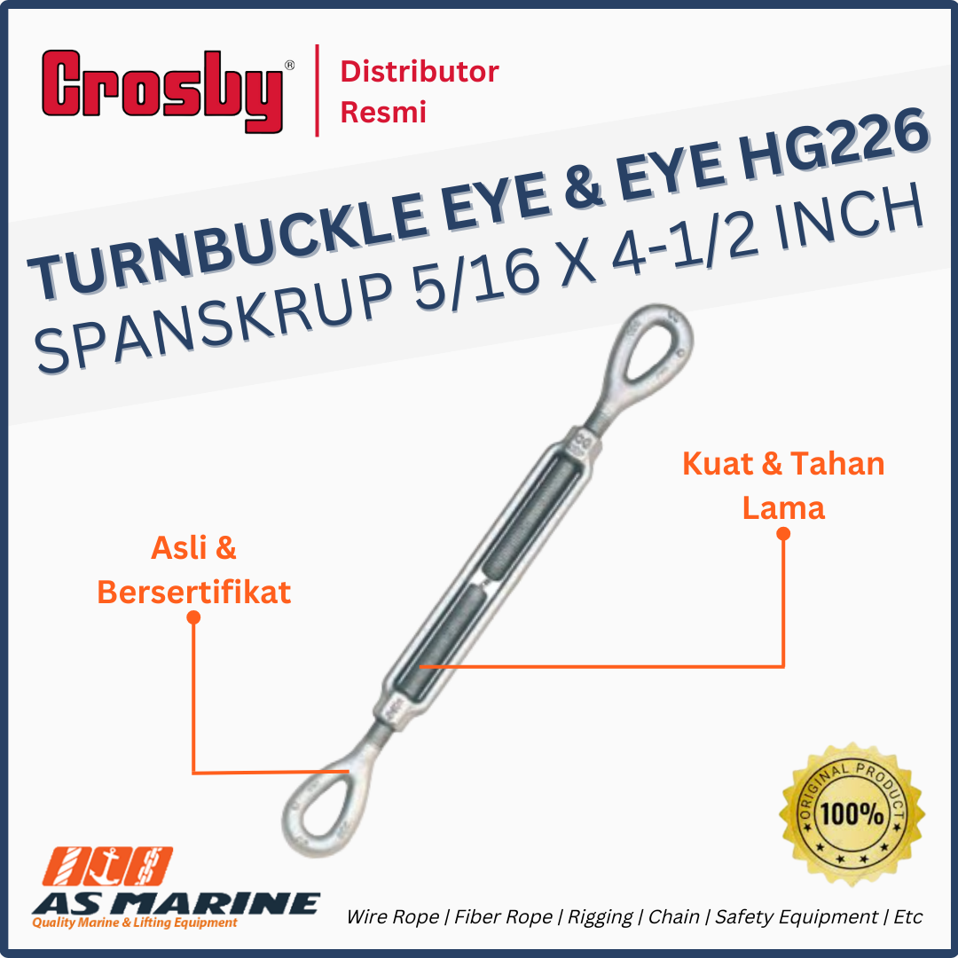 PT. Anugrah Sukses Marine adalah importir & distributor resmi CROSBY USA berstandar internasional & kami telah tersertifikasi ISO 9001:2015 & ISO 45001:2018. Kami jual CROSBY USA Turnbuckle / Spanskrup Eye & Eye HG226 5/16 x 4-1/2 Inch dan berikut spesifikasinya :