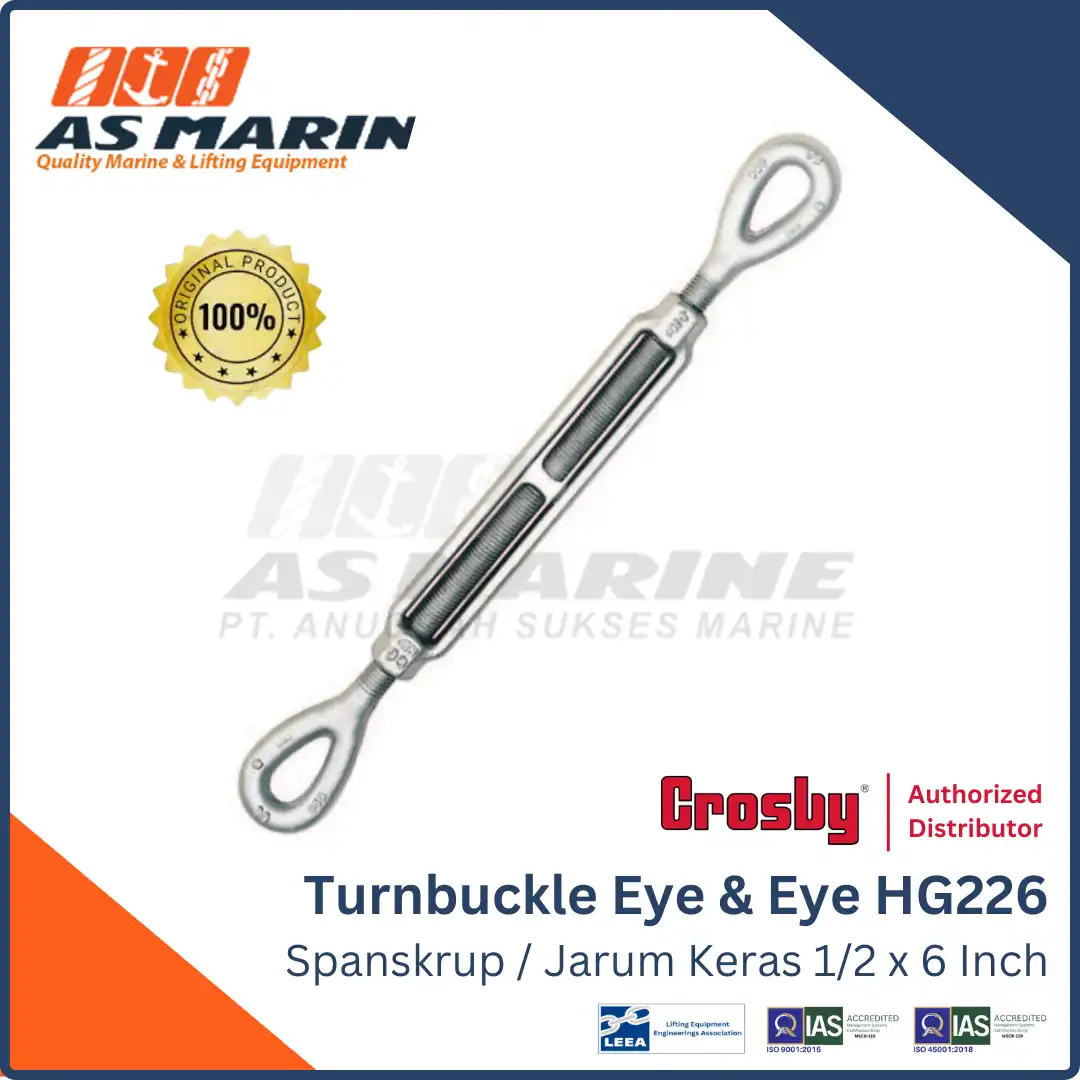 PT. Anugrah Sukses Marine adalah importir & distributor resmi CROSBY USA berstandar internasional & kami telah tersertifikasi ISO 9001:2015 & ISO 45001:2018. Kami jual CROSBY USA Turnbuckle / Spanskrup Eye & Eye HG226 1/2 x 6 Inch dan berikut spesifikasinya :