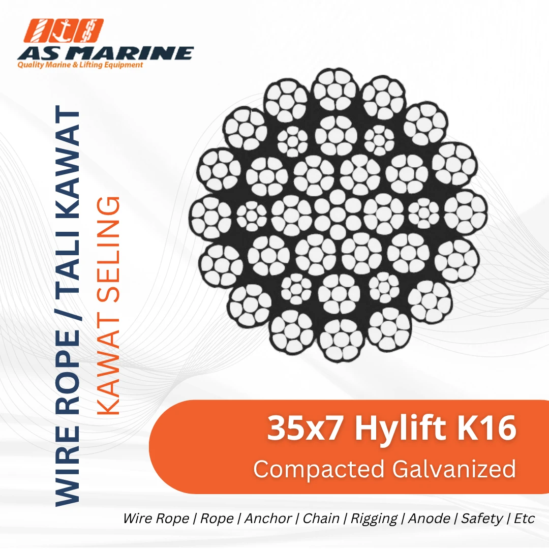 PT. Anugrah Sukses Marine adalah importir & distributor resmi berstandar internasional & kami telah tersertifikasi ISO 9001:2015 & ISO 45001:2018. Kami jual Wire Rope 35x7 Hylift K16 Compacted Galvanized dan berikut spesifikasinya :