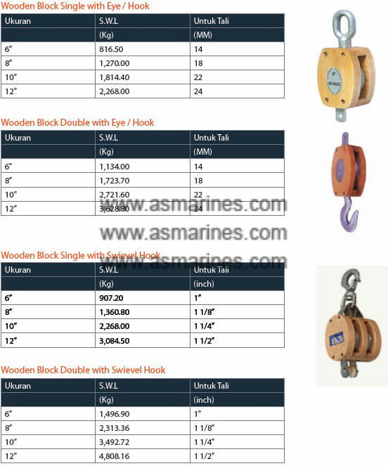 Kami menjual block kayu atau wooden block dari RRT tipe sambungan: eye atau swievel hook dan tipe satu atau dua roda. Wooden block / block kayu yang pakai diatas kapal untuk mengikat layar atau menurunkan liferaft / sekoci penyelamat.