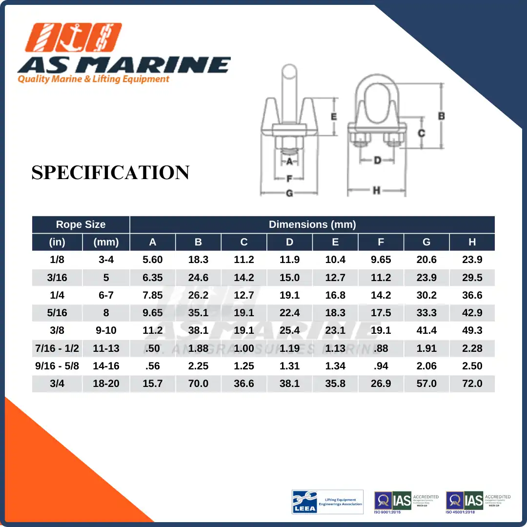 PT. Anugrah Sukses Marine adalah importir & distributor resmi CROSBY USA berstandar internasional & kami telah tersertifikasi ISO 9001:2015 & ISO 45001:2018. Kami jual Wire Rope Clip / Klem Sling / Kausen Sling G450 9/16-5/8 Inch (14-16 mm) dan berikut spesifikasinya :